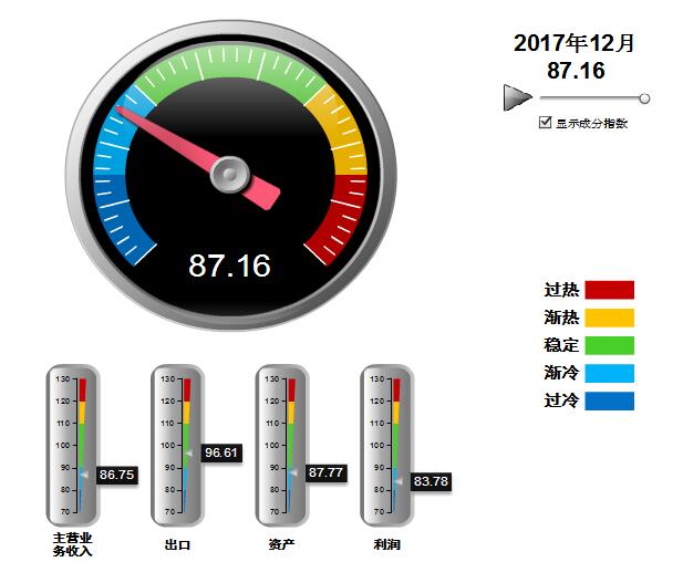 2016年11月至2017年12月,中轻皮革景气指数基本稳定,在90附近小幅波动,处于渐冷提示区运行(参见图3)。