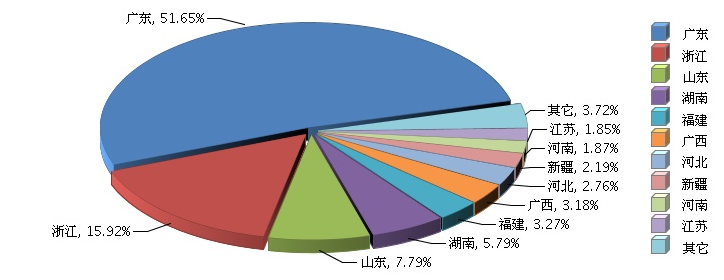 据海关数据显示,2017年我国陶瓷餐具出口主要集中在广东、浙江,两省陶瓷餐具出口占我国陶瓷餐具出口总额的近70%,其中广东完成累计出口额26.63亿美元(同比增长1.08%),占51.65%;浙江完成累计出口额8.21亿美元(同比增长-0.8%),占15.92%。从出口增速看,河南、江苏两省增速居前,其中河南同比增长26.91%;江苏同比增长24.91%;出口前十地区中,仅新疆、河北、浙江同比下降,分别为-11.46%、-3.26%、-0.80%。