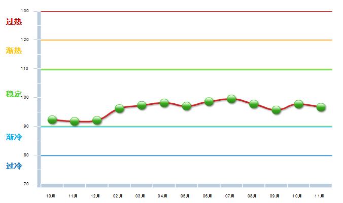 图2 2016.10—2017.11自行车行业景气指数变化态势