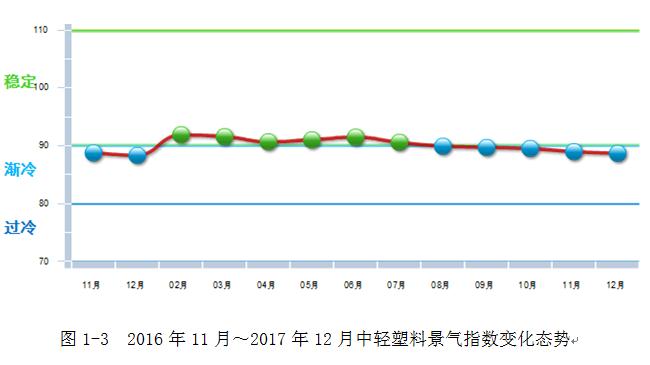 中国轻工业经济运行及预测预警系统监测显示:2017年12月份中轻塑料景气指数为88.69,比11月份回落0.28点。目前,塑料景气指数连续六个月走低,其中,近五个月运行在蓝色渐冷区间。