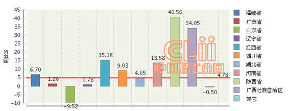 图3 2013年1~9月全国陶瓷砖累计产量主要地区同比增长情况