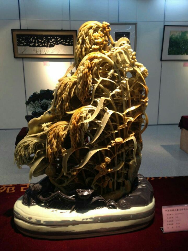 2015年中国传统工艺美术精品展近日在北京国粹苑落下帷幕,以广东丰顺石取材的作品《金秋》一举摘得此次“巧夺天工-金马奖”展评活动的特等奖桂冠。