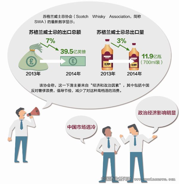 苏格兰威士忌协会(Scotch Whisky Association,简称SWA)的最新数字显示,2014年苏格兰威士忌的出口总额为39.5亿英镑,相比2013年下降了3.1亿英镑,下降幅度为7%。从数量来看,去年苏格兰威士忌总出口量下降3%,至11.9亿瓶(700ml装)。该协会称,这一下滑主要来自“经济和政治因素”,其中包括中国反对奢侈浪费,倡导节俭,减少了对这种高档酒的消费。