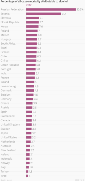 俄罗斯人嗜酒到底有多严重?几乎可以说是“往死里喝”。根据世界卫生组织(WHO)的数据,2012年俄罗斯死亡人口中高达30.5%都与酒精有关。这在所有有数据的国家中都是遥遥领先,排名第二的爱沙尼亚比例为21.4%,其他所有国家都低于10%,最低的以色列仅1.1%。中国为6.3%。