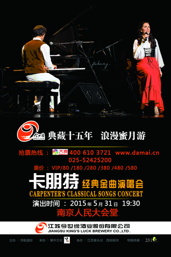 由江苏今世缘酒业冠名、江苏寅午文化主办的“典藏十五年,浪漫蜜月游”《Yesterday Once More》卡朋特乐队,世界巡回演唱会南京站,将于5月31日19点30分在南京人民大会堂精彩亮相,带给南京市民一场欧美流行音乐昔日经典盛宴。