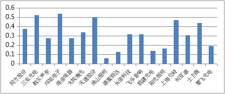 在17家LED企业中,发明专利申请占总申请的比例,最大的为53.84%,最小的为5.93%,平均比例达到31.38%,随着企业的发展,百亿级企业的核心竞争力的差距也会逐渐增大。