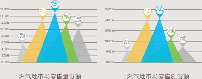 同时,我们从中怡康2015年整体燃气灶市场数据可以看到:由于2015年燃气灶在材质,产品结构上均实现飞跃性突破,目前市场上主要以嵌入式、双灶眼产品为主。最受消费者欢迎的品牌以老板,方太,美的,华帝为主。市场竞争日益激烈的情况下,老板以14.64%的销售量和销售额占据第一阵营。