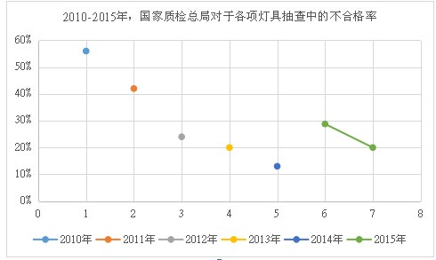 2010-2015年,国家质检总局对于各项灯具抽查中的不合格率