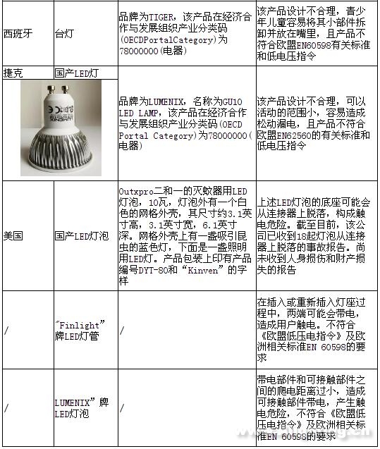 2月,欧盟委员会非食品类快速预警系统召回3款中国产LED灯具。其中“ATOPSUN”牌灯具和“GT Industrial”牌灯具带电部件与易接触金属之间的电绝缘不足,用户有被电击的危险。2款产品均不符合《欧盟低压电指令》及欧洲相关标准EN 60598的要求。另一款“Party Lighting”牌灯具含有短链氯化石蜡,具有致畸、致病、致突变的毒性,检测值高达1.1%,不符合《欧盟持久性有机污染物法规》的要求。