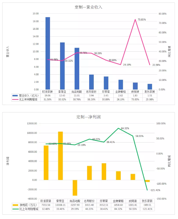 定制类,欧派家居、索菲亚、尚品宅配营收位居前三,其中欧派营收最高,19.06亿元;索菲亚净利润最高,达1.03亿元;尚品宅配今年第一季度的净利润依然为负,与上年-4657.14相比,今年-3297.9万元,同比上升了29.19%;另一家净利润也有亏损的是我乐家居,-389.01万元,较去年的-175.69万元,同比下降121.41%。