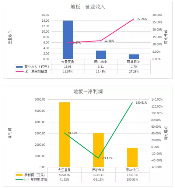 地板类,大亚圣象营收和净利润位居第一。报告期内,大亚圣象营收13.98亿元,同比增加11.07%,净利润5750.36 万元,比上年同期增加41.32%。由于费用管控逐见成效,利润大幅增长。