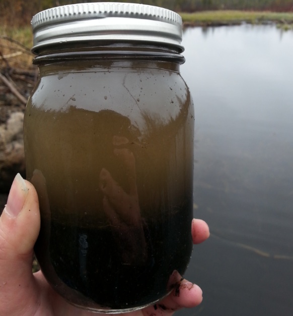 来自加拿大安大略省奥罗克里克流域的河床沉积物(与水混合)样本。下方的深色很可能是由有机物造成的,而白色斑点可能是微型塑料,尽管测试还没有证实这一点。