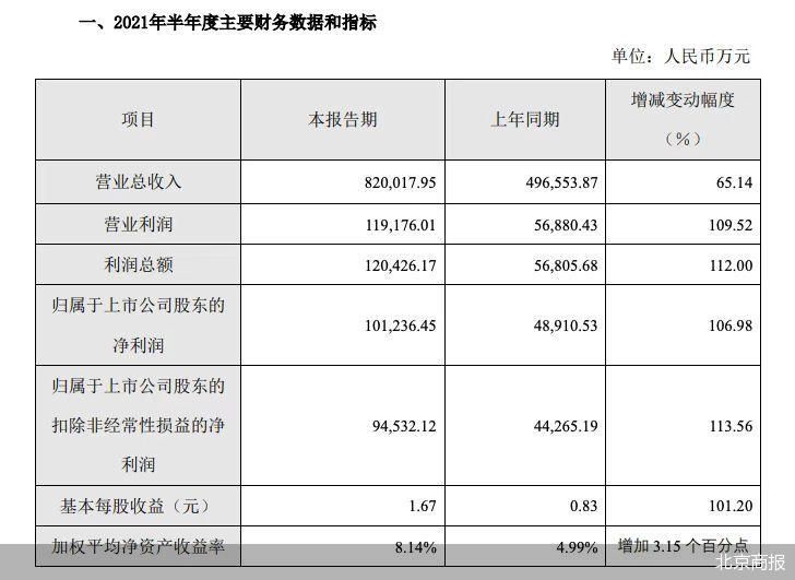 2021年8月11日,欧派家居集团股份有限公司(以下简称“欧派家居”)发布《2021年半年度业绩快报公告》显示,报告期内营业收入约为82亿元,同比增加65.14%;归属于上市公司股东的净利润约为10.12亿元,同比增加106.98%。
