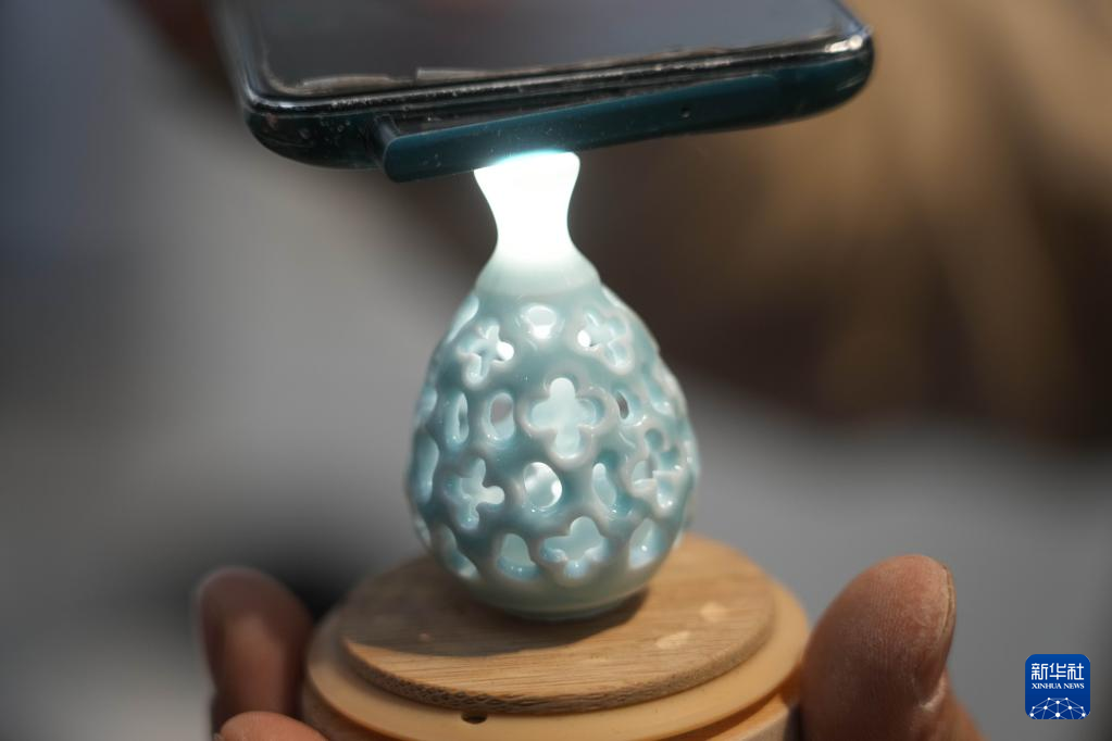 12月14日,王文化借助灯光展示一个微型陶瓷镂空花瓶。