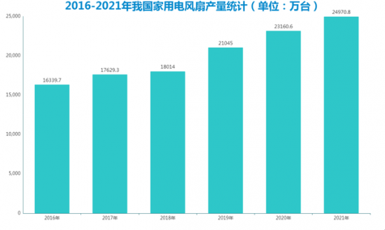 据全拓数据调查统计,2016-2021年我国家用电风扇产量整体上呈现上升趋势,其中,2016年我国家用电风扇产量为16339.7万台;2021年我国家用电风扇产量达到最高值,为24970.8万台。