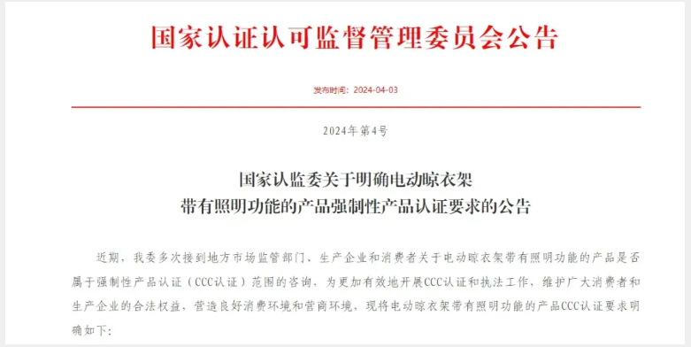 考虑到上述电动晾衣架带有照明功能的产品为晾晒类产品新形式,相关方对该产品CCC认证要求的认识还不清晰,《公告》要求各地市场监管部门和指定认证机构、实验室在上述产品执法和认证检测工作中,应加强宣传,督促未获证企业尽快申请认证;相关生产企业应尽快办理CCC认证并于2024年12月31日前取得认证。2025年1月1日起,上述产品未按要求获得CCC认证的,不得出厂、销售、进口或者在其他经营性活动中使用。