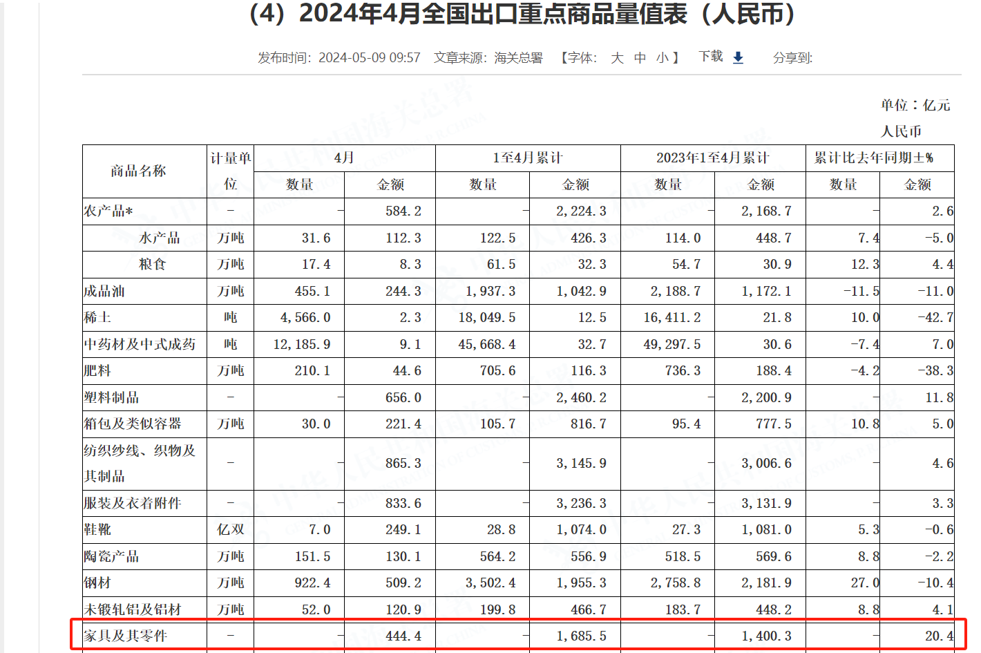 据海关总署数据显示,中国家具及其零件的出口在今年前四个月表现出色,总额达到1685.5亿元,与去年同期相比增长了20.4%,创下历史同期的新纪录。