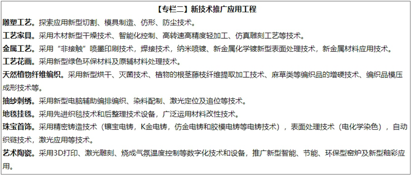 (二)加强工艺设备升级。支持建立一批传承创新发展平台,加强对工艺美术传统技艺的挖掘整理、系统记录和科学研究。支持企业加大对传统产品制作技艺的发掘与传承,在保持传统配方、工序和核心技艺的基础上,探索计算机辅助设计等专用系统与装备的研究应用,通过设备改造、工艺改良、关键技术突破等,助力工艺创新。加强节能设备和技术推广应用,实现减污降碳、绿色节能发展。