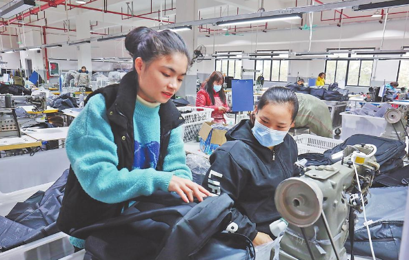 近日,天等县返乡创业园广西奥冠皮具有限公司生产车间内,缝纫机的“嗒嗒”声此起彼伏,工人们正忙碌地裁剪、缝纫,现场一片繁忙的生产景象。