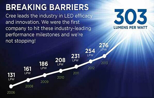 图:LED发光效率趋势图(图片来源:CREE)