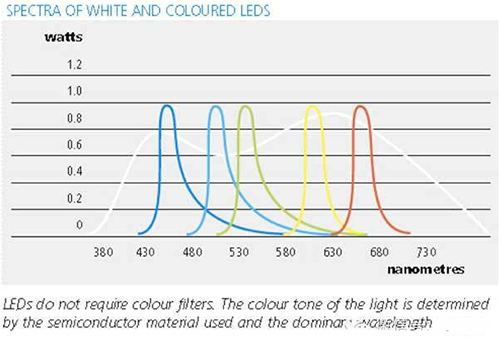 图:白光LED和各种颜色LED光谱