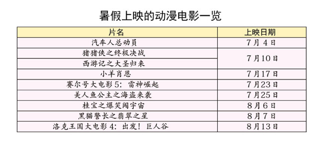 据了解,今年7月起陆续上映的动画电影包括《赛尔号大电影5:雷神崛起》、《洛克王国大电影4:出发!巨人谷》、《西游记之大圣归来》、《美人鱼公主之海盗来袭》、《桂宝之爆笑闯宇宙》、《猪猪侠之终极决战》、《小羊肖恩》。从过往数据看,赛尔号、洛克庄园、摩尔庄园以及猪猪侠都已经有一定数量的受众群体基础,其中,去年底开始猪猪侠动画对于玩具销售就已经起到非常明显的推动作用。