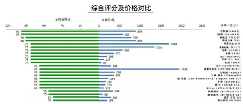 为了向消费者反映更为直观、全面的比较试验结果,广州市消委会分别选取了视网膜蓝光危害等级、光度学要求(300mm最小照度、照度均匀度)、光度学要求(500mm最小照度、照度均匀度)、显色指数、频闪、光源舒适性(是否刺眼)、光源角度可调性等6项测试指标,对参与测试的所有样品进行评分,并结合价格进行综合评价(详见下图)。