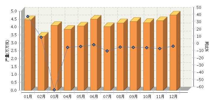 根据国家统计局公布数据,2013年全国皮革鞋靴行业累计完成产量49.25万万双,同比增长2.63%。其中: 12月份完成产量4.76万万双,同比增长1.41%。2013年月度数据走势及同比增长情况如下图所示。