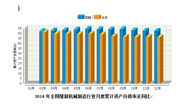 2014年1~12月,全国缝制机械制造行业累计资产负债率为45.93%,同比增长-6.24%。其中:1月~2月份累计资产负债率为50.9%,同比增长-0.94%;1月~3月份累计资产负债率为49.34%,同比增长-3.2%;1月~4月份累计资产负债率为49.32%,同比增长-3.62%;1月~5月份累计资产负债率为48.86%,同比增长-4.64%;1月~6月份累计资产负债率为49.19%,同比增长-5.02%;1月~7月份累计资产负债率为48.8%,同比增长-4.89%;1月~8月份累计资产负债率为46.96%,同比增长-6.61%;1月~9月份累计资产负债率为46.25%,同比增长-7.72%;1月~10月份累计资产负债率为46.06%,同比增长-6.65%;1月~11月份累计资产负债率为46.12%,同比增长-6.23%;1月~12月份累计资产负债率为45.93%,同比增长-6.24%。
