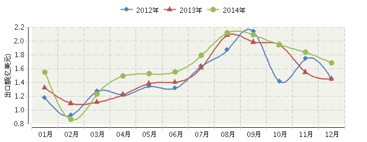 2014年全国化妆品行业连续三年月度出口额对比