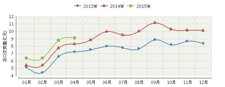 2015年1月~4月,全国乐器制造行业累计完成出口交货值31.46亿元,同比增长7.71%。其中:1月份完成出口交货值6.41亿元,同比增长4.34%;2月份完成出口交货值6.41亿元,同比增长4.34%;3月份完成出口交货值8.8亿元,同比增长5.04%;4月份完成出口交货值9.13亿元,同比增长6.24%。