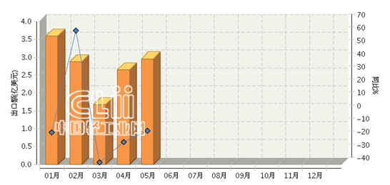 2015年1~5月,全国荧光灯及放电灯管行业累计完成出口额13.74亿美元,同比增长-11.78%。其中:5月份完成出口额2.96亿美元,同比增长-13.99%。