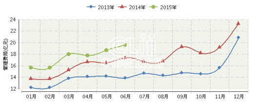 2015年全国照明行业连续三年月度管理费用对比