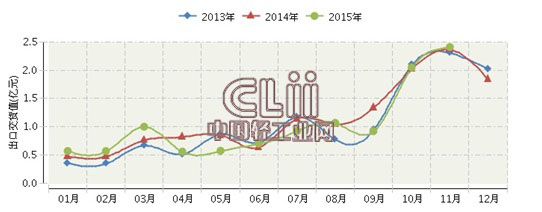 2015年江西电光源制造行业连续三年月度出口交货值对比