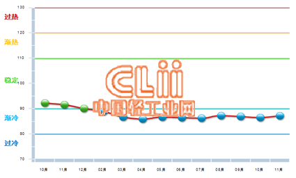 2015年11月中轻陶瓷景气指数87.16,较上月回升0.72,位于渐冷区间,参见图1-1。