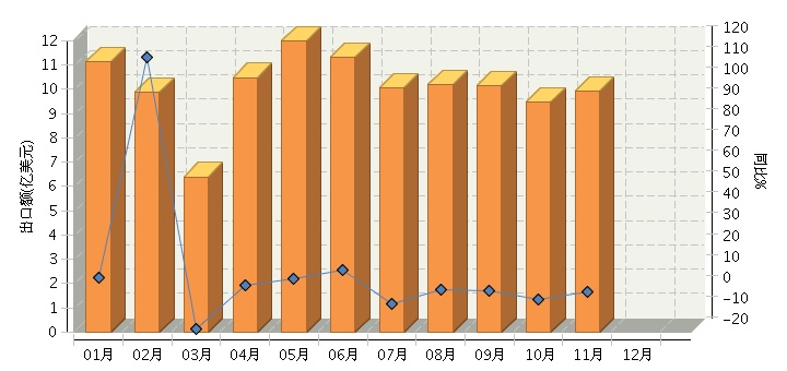 根据海关总署发布数据,2015年1月~11月,全国文教办公用品行业累计完成出口额110.77亿美元,同比增长4.68%。其中:1月份完成出口额11.14亿美元,同比增长5.95%;2月份完成出口额9.86亿美元,同比增长112.19%;3月份完成出口额6.38亿美元,同比增长-18.6%;4月份完成出口额10.49亿美元,同比增长2.29%;5月份完成出口额11.99亿美元,同比增长5.48%;6月份完成出口额11.31亿美元,同比增长9.78%;7月份完成出口额10.04亿美元,同比增长-6.22%;8月份完成出口额10.19亿美元,同比增长0.42%;9月份完成出口额10.14亿美元,同比增长0.05%;10月份完成出口额9.46亿美元,同比增长-4.44%;11月份完成出口额9.93亿美元,同比增长-0.8%。2015年全国文教办公用品月度出口额及同比增长趋势如下图所示。