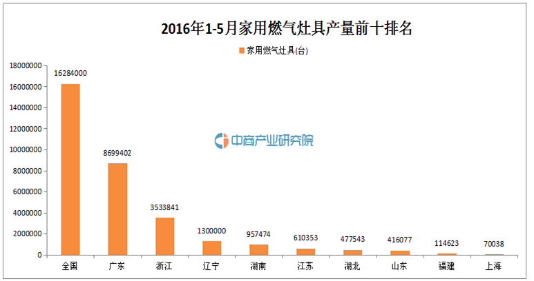 ,2016年1-5月全国家用燃气灶具产量为16284000台。其中,广东以8699402台的产量位居全国家用燃气灶具产量第一。