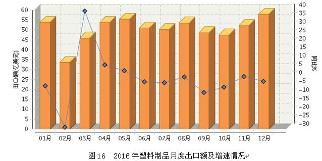 中国轻工业经济运行及预测预警系统监测显示:2016年,全国塑料制品行业海关出口额577.25亿美元,同比下降5.46%。其中:12月份完成出口额57.85亿美元,月度出口额为年内单月最高值,同比下降1.88%,月度出口增速在连续两个月回升之后再次回落。