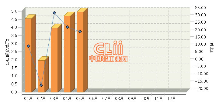 据海关数据显示,2017年1~5月,全国陶瓷制餐具累计出口20.11亿美元,同比增长16.69%。其中:5月份完成出口额4.96亿美元,为年内单月最高值,同比增长21.22%。