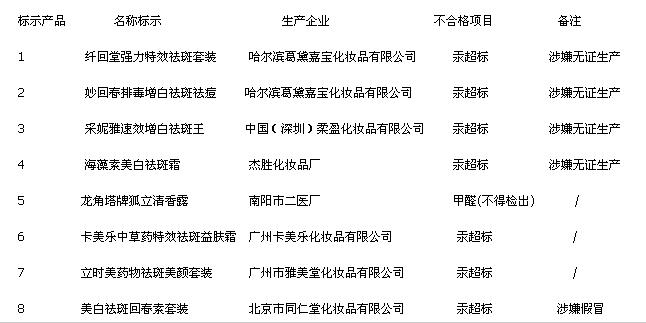 1月14日,记者从兰州市食药监局了解到,“纤回堂强力特效祛斑套装”等8批产品在抽检中发现有违法添加和使用禁限用物质,产品不合格被曝光。