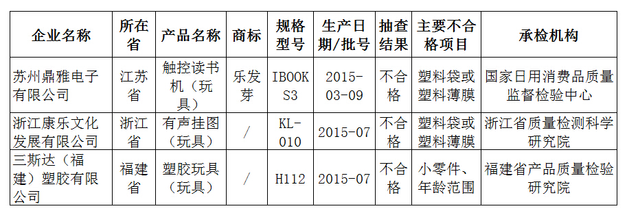 抽查发现有3批次产品不符合标准的规定,涉及到小零件、塑料袋或塑料薄膜、年龄范围项目。以下是不合格产品名单: