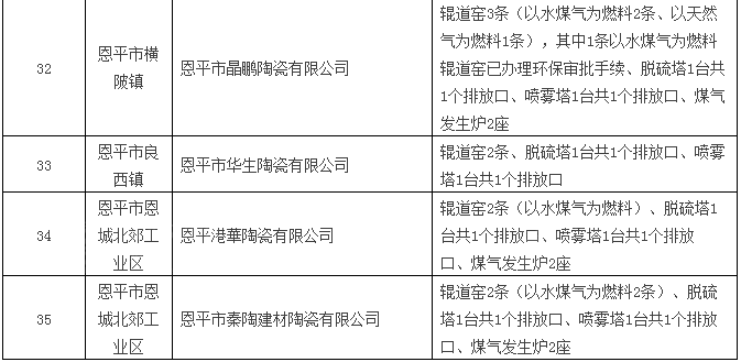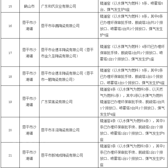 据悉,恩平沙湖镇有13家陶瓷生产企业,共71条生产线,其中8条天然气为燃料的生产线,63条水煤气为燃料的生产线中46条办理了环评审批,而横陂镇4家陶企共15条生产线,天然气为燃料的生产线4条,其中11条水煤气为燃料的生产线中10条办理了环评手续。