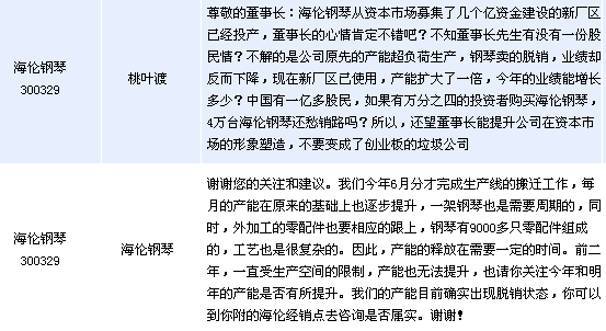 全景网11月6日讯 海伦钢琴(300329,股吧)(300329)周三在全景网互动平台上回答投资者提问时表示,公司今年6月份才完成生产线的搬迁工作,每月的产能在原来的基础上也逐步提升。由于钢琴工艺很复杂,产能释放需要一定时间,目前公司产品确实出现脱销情况。