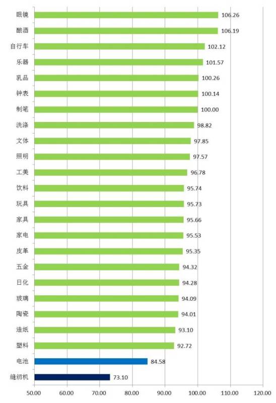 从分行业运行指数来看,在重点监测的24个行业中,电池行业处于趋冷区间、缝纫机行业处于过冷区间。未出现景气指数趋热的行业。