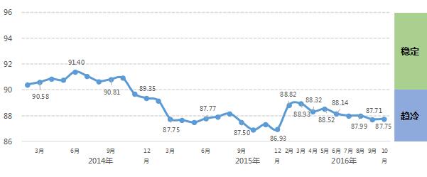 中国轻工业经济运行及预测预警系统数据显示:2016年10月份中轻景气指数为87.75,环比上升0.05点,仍处于蓝色渐冷区间。本年前10月该指数呈波动下行走势,10月较年初下降1.07点。