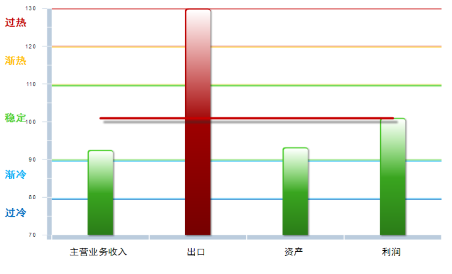 从分项指数看,出口景气度有较明显回升,其他三项分项指数均环比上月下降,其中:主营业务收入景气指数92.56,位于“稳定”区间,较上月微升0.16点;出口景气指数为166.56,位于“过热”区间,较上月大幅上升22.16点;资产景气指数为93.24,位于“稳定”区间,较上月下降0.64点;利润景气指数101.03,位于“稳定”区间,较上月微升0.01点。