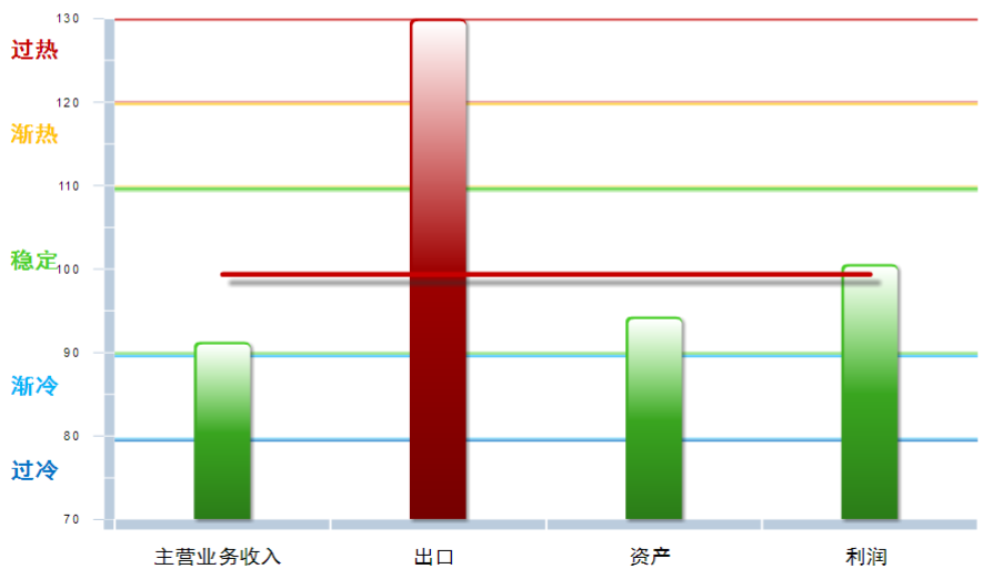从分项指数环比变化看,除主营业务收入景气指数外,其他三项指数均上升,其中:主营业务收入景气指数91.28,位于“稳定”区间,较上月下降0.31点;出口景气指数为155.14,位于“过热”区间,较上月上升38.31点;资产景气指数为94.32,位于“稳定”区间,较上月回升0.27点;利润景气指数100.61,位于“稳定”区间,较上月回升1.99点。