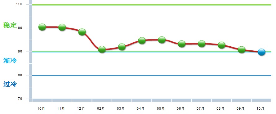 分项景气指数中,主营业务收入、利润景气指数环比小幅下降,出口和资产均较上月回升,其中:主营业务收入景气指数91.28,位于“稳定”区间,较上月下降0.62点;出口景气指数为101.85,位于“稳定”区间,较上月上升3.88点;资产景气指数为90.91,位于“稳定”区间,较上月回升0.15点;利润景气指数79.36,位于“过冷”区间,较上月下降5.13点。