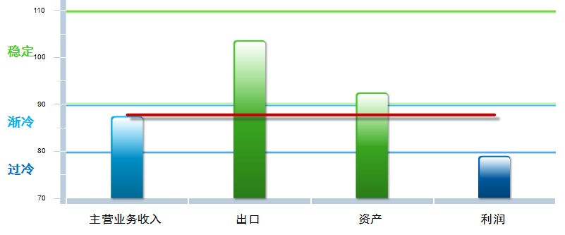 分项景气指数中,出口、利润景气指数环比小幅回升,主营业务收入和资产均较上月下降,其中:主营业务收入景气指数87.46,位于“渐冷”区间,较上月下降0.01点;出口景气指数为103.63,位于“稳定”区间,较上月上升0.9点;资产景气指数为92.50,位于“稳定”区间,较上月下降0.45点;利润景气指数79.01,位于“稳定”区间,较上月回升0.9点。