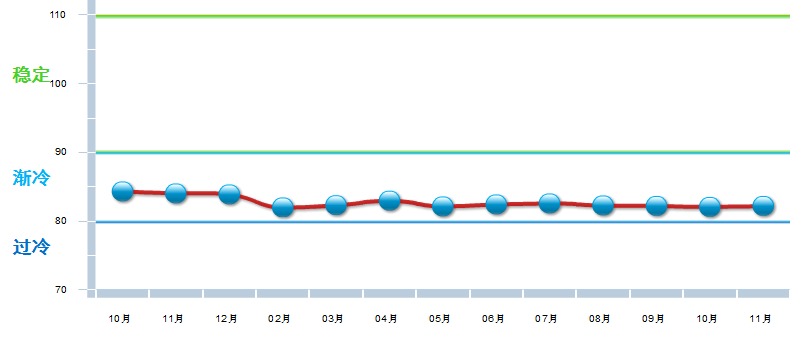 分项景气指数中,出口、资产、利润景气指数环比小幅回升,主营业务收入指数下降,其中:主营业务收入景气指数81.23,位于“渐冷”区间,较上月下降0.52点;出口景气指数为92.42,位于“稳定”区间,较上月上升3.89点;资产景气指数为84.67,位于“渐冷”区间,较上月上升0.04点;利润景气指数77.92,位于“过冷”区间,较上月回升0.28点。
